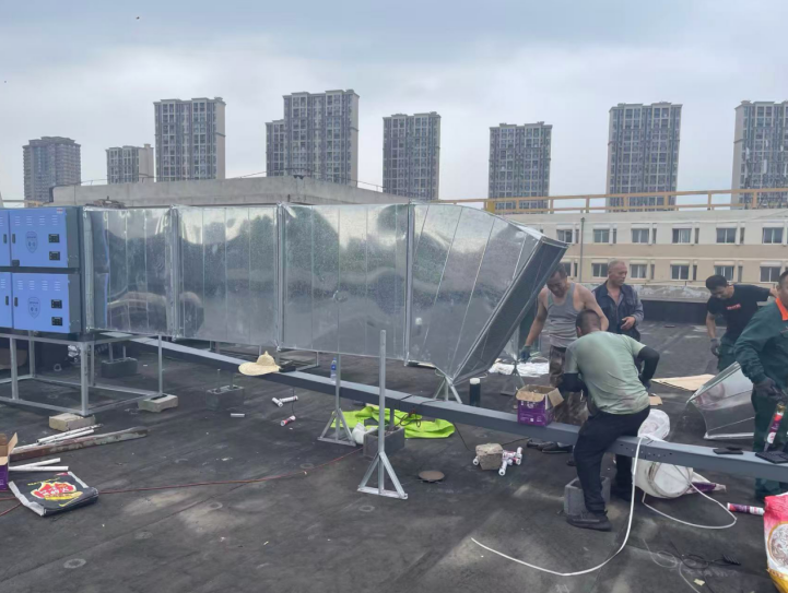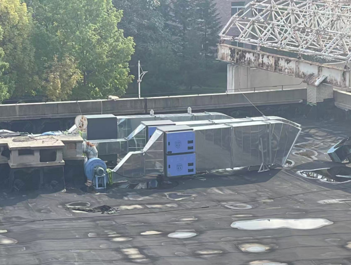 图为蒲河校区食堂油烟净化器安装作业正在施工
