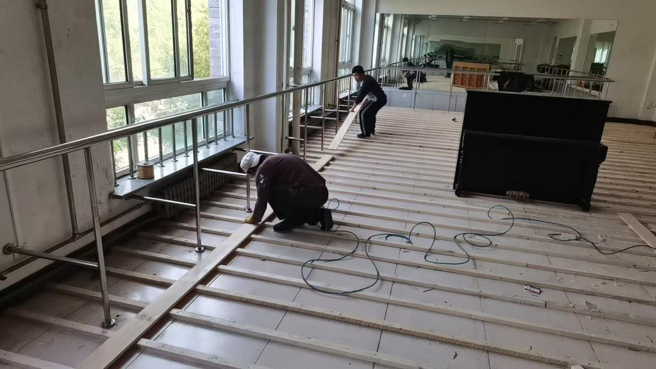图为蒲河校区艺馨楼315教室铺装实木长条地板作业现场
