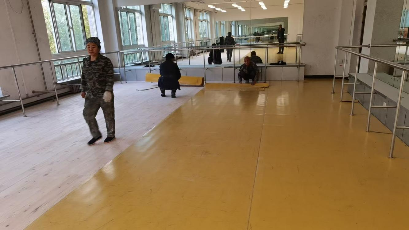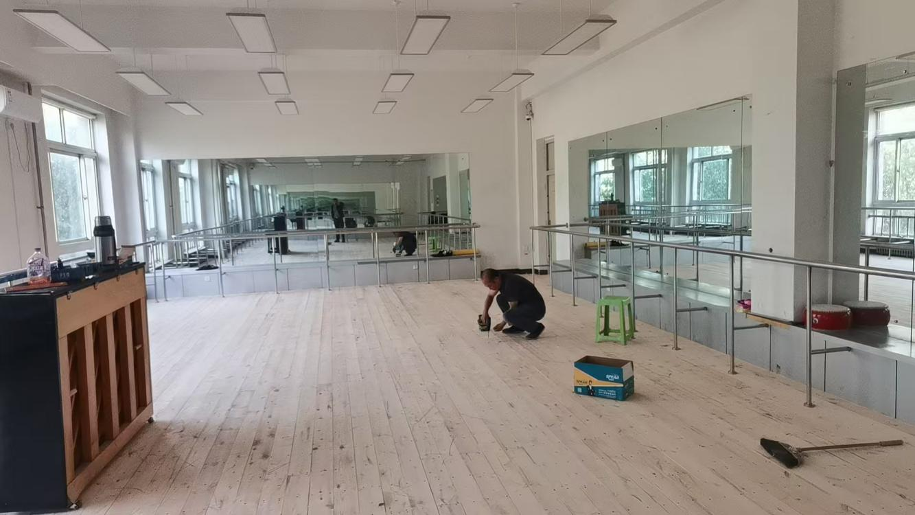 蒲河校区艺馨楼315教室地板改造工程(应急修缮项目),于10月1日开工,10月7日竣工,10月9日验收合格。项目施工内容主要包括:拆除原有塑胶地板和复合地板、铺设实木长条地板龙骨(木方骨)、铺装实木长条地板、对实木地板进行打磨和清理、重新铺设原有塑胶地板以及塑胶地板焊线处理等。改造后的315教室地板整洁舒适、安全防滑,美观度和舒适度大幅提升。实木地板与塑胶地板的结合,为师生营造了更优质、更安全的练习环境,有力地促进了艺术学院教学活动的开展。