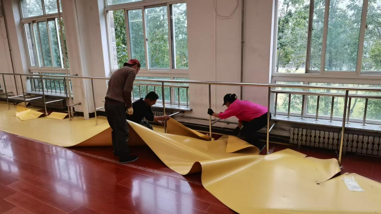 图为蒲河校区艺馨楼315教室铺设原有塑胶地板作业现场