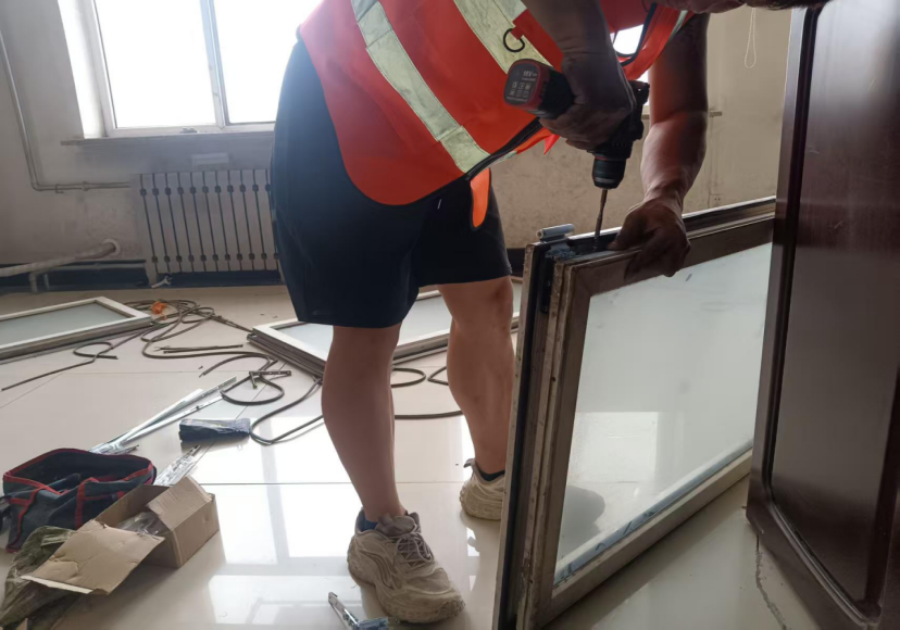 图为蒲河校区文华楼塑钢窗及纱窗安装作业