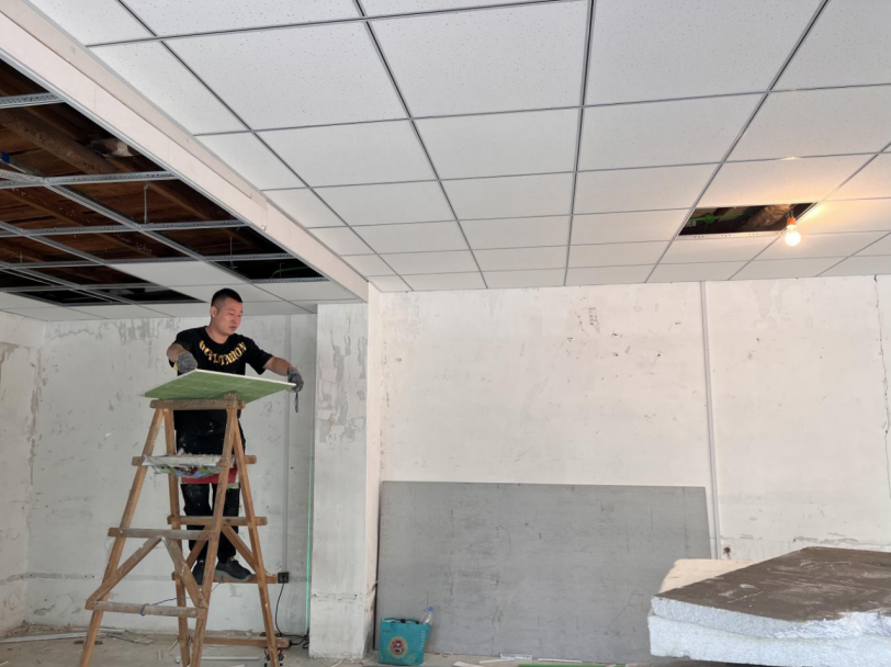 图为崇山校区退休教师活动室平房室内吊顶安装作业