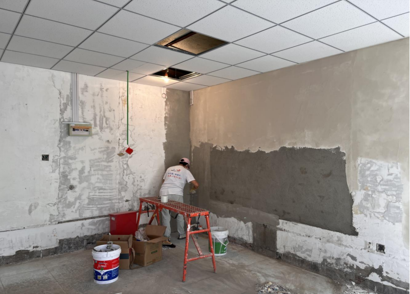 图为崇山校区退休教师活动室平房墙面抹灰大白粉饰作业