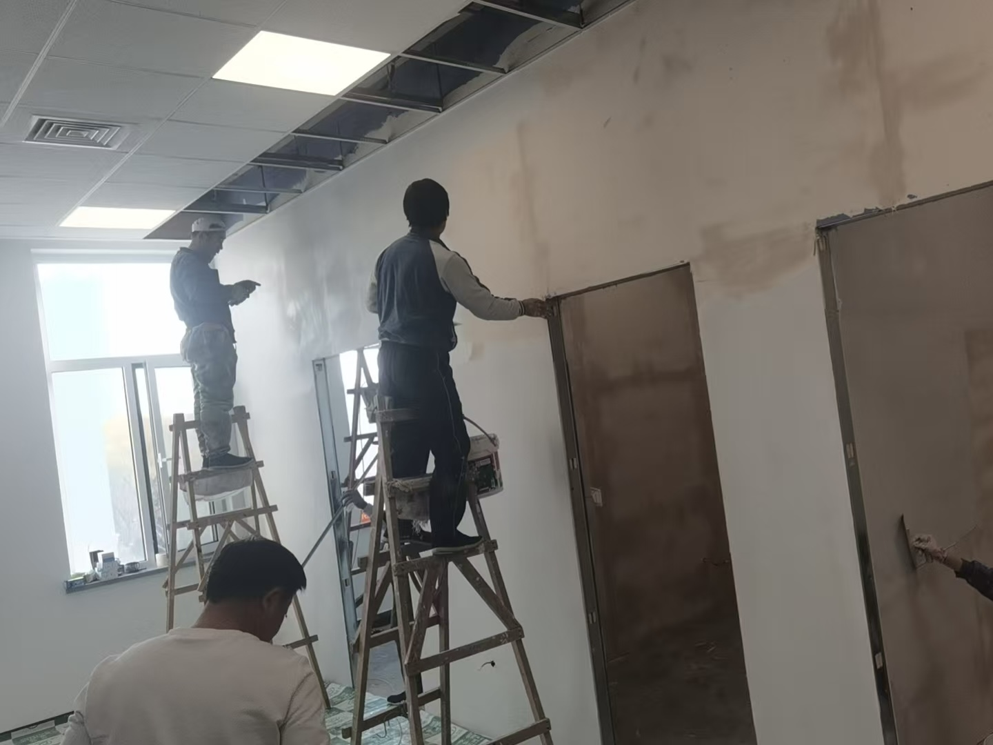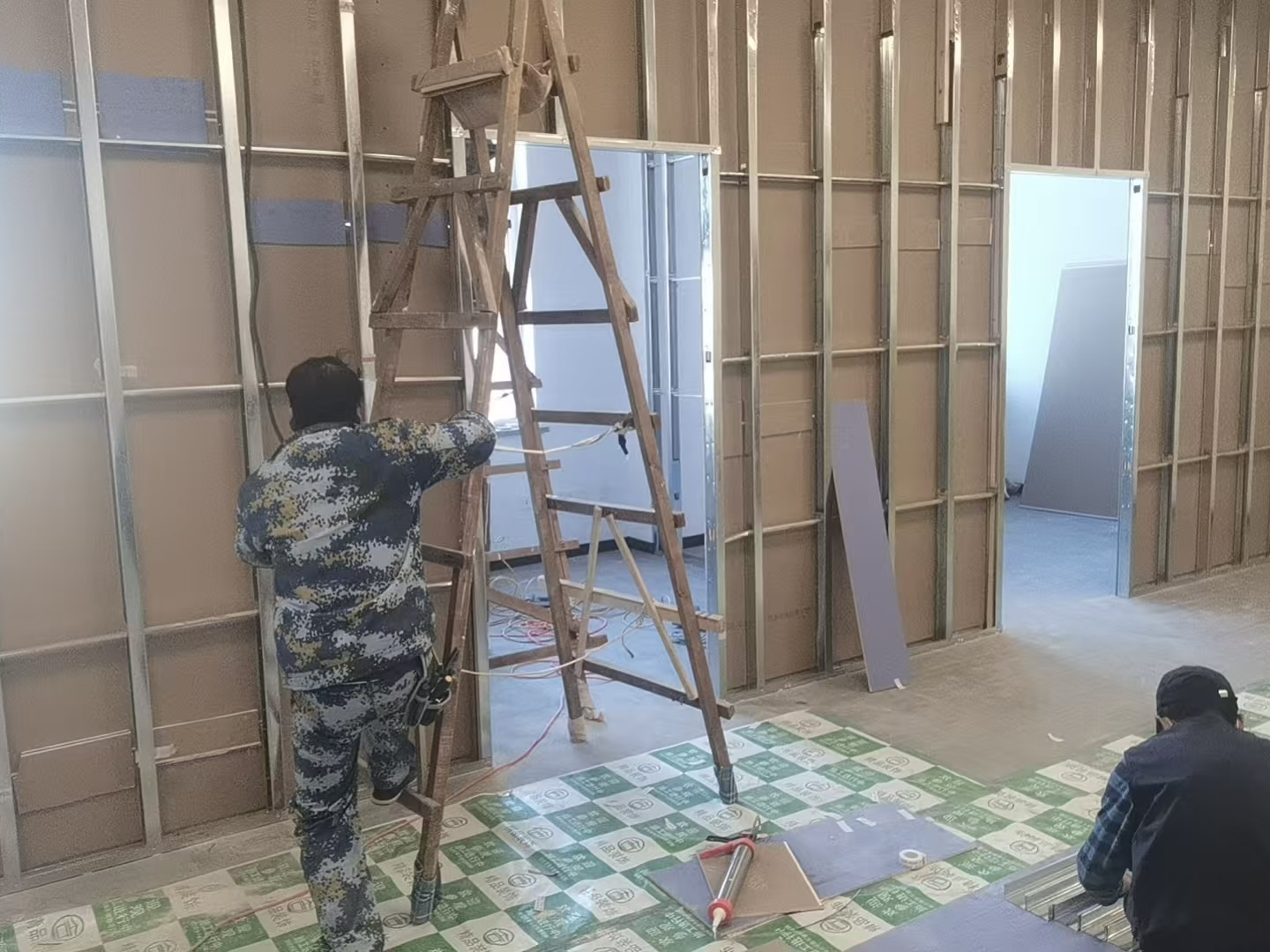 图为蒲河校区纪检监察楼440房间石膏板墙安装作业