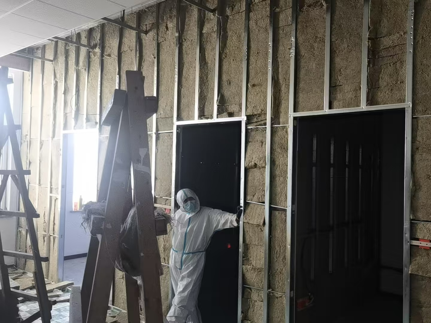 图为蒲河校区纪检监察楼343房间墙体隔音岩棉铺设作业