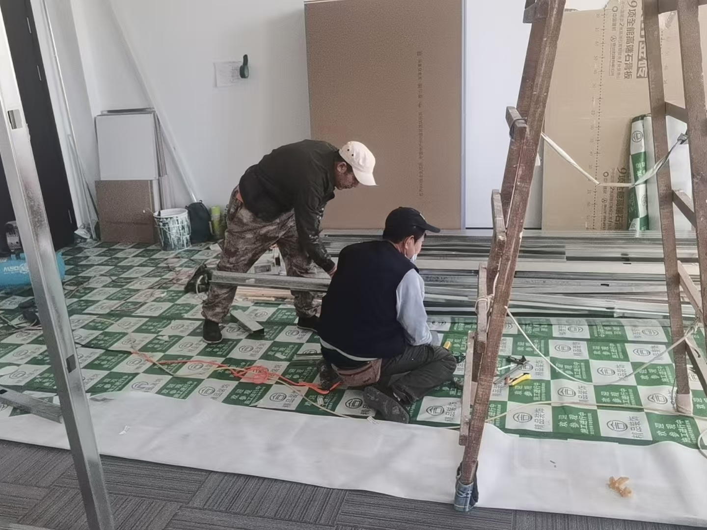 图为蒲河校区纪检监察楼440房间轻钢龙骨拼接作业