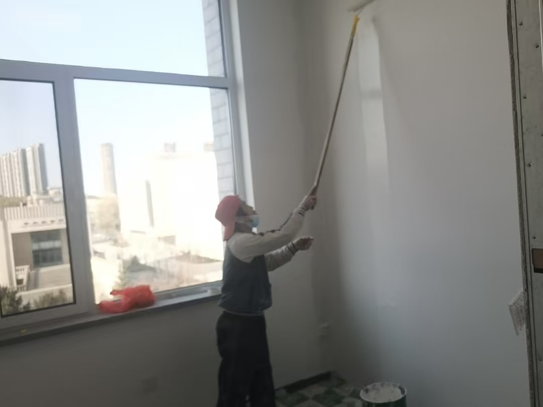 图为蒲河校区纪检监察楼440房间墙面粉饰作业