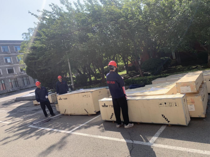 图为崇山校区法硕楼电梯到货进行检查作业
