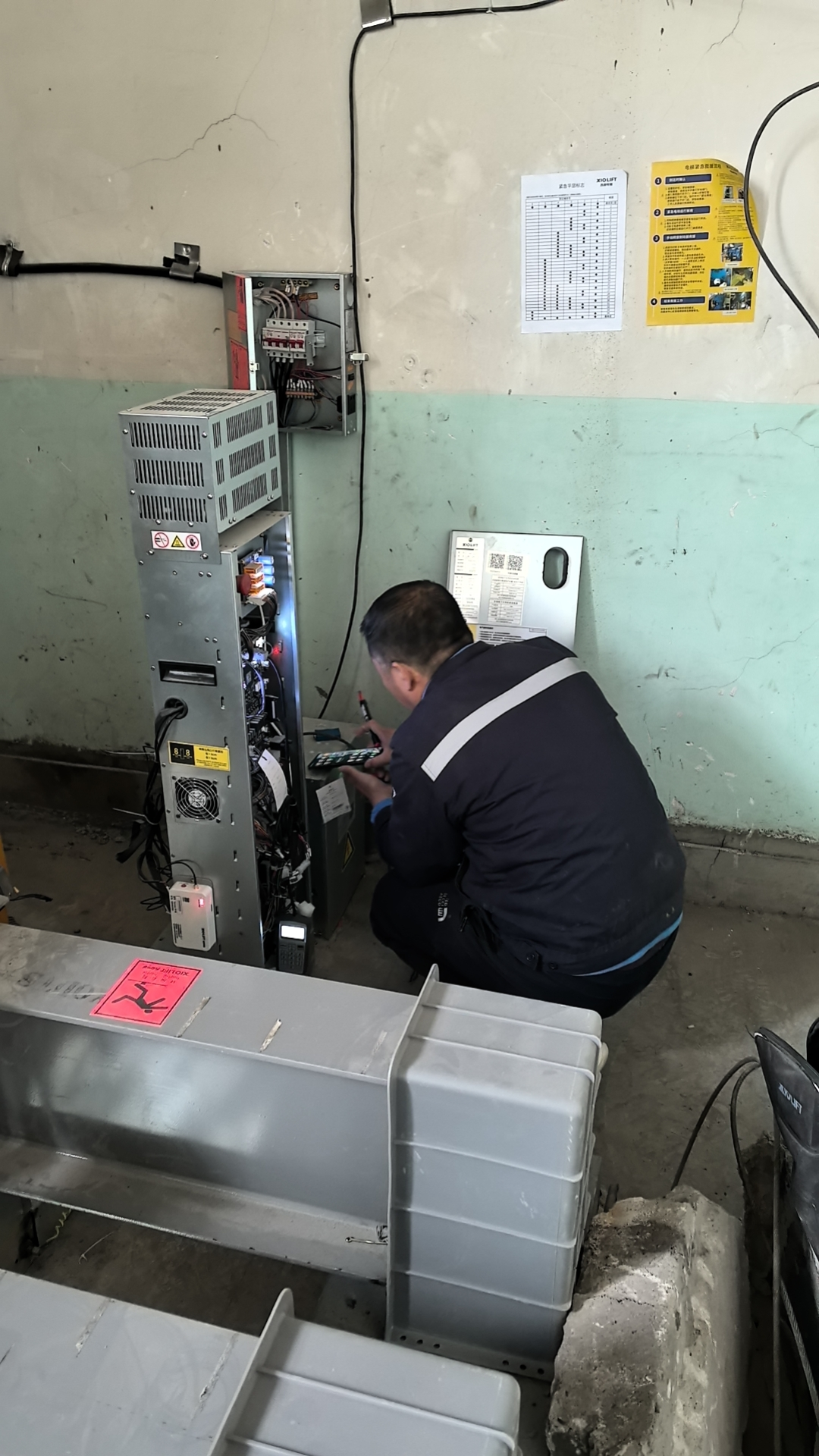 图为崇山校区蕙星楼西侧电梯机房控制设备安装作业