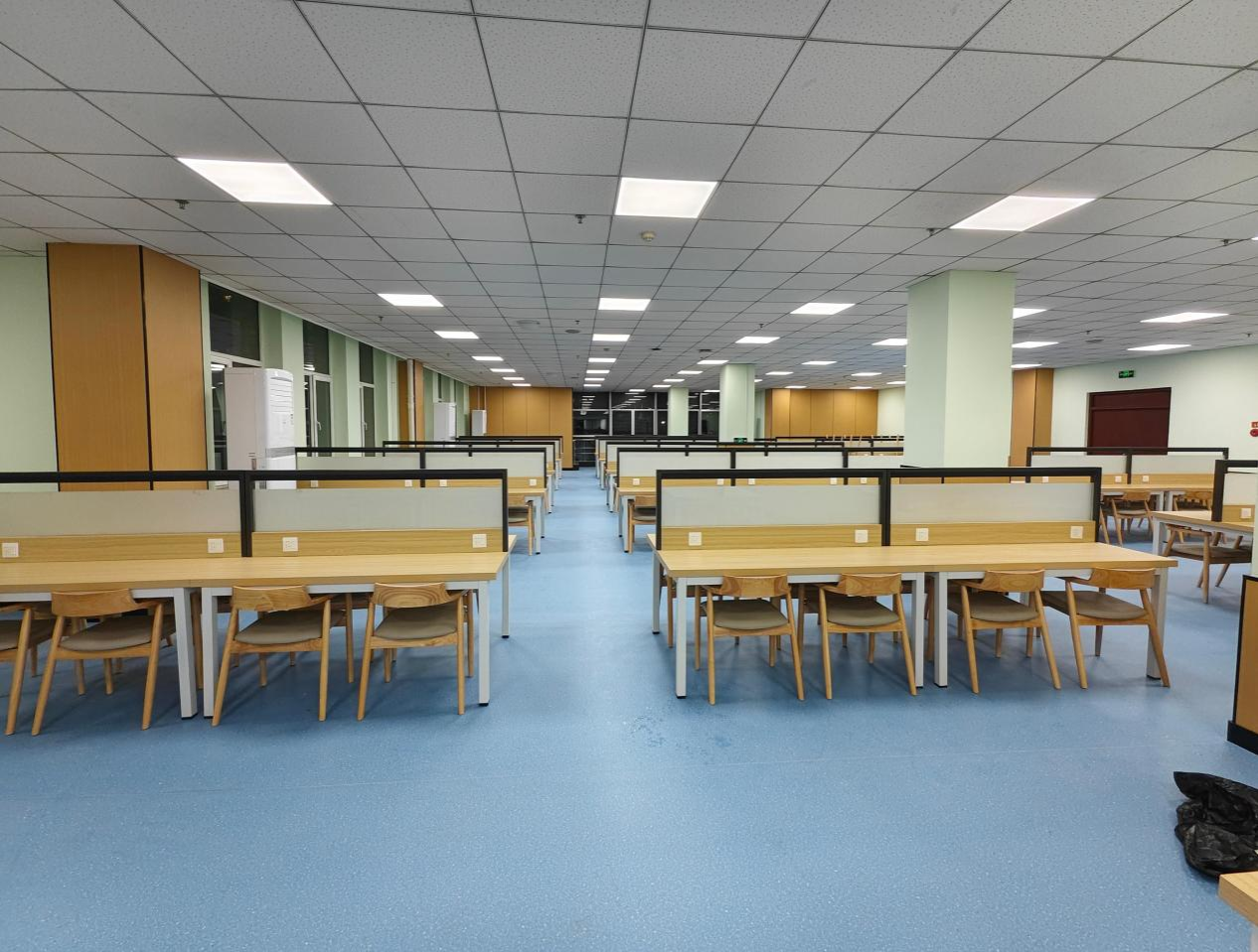 施工主要内容包括:铺设混凝土地面基层及地胶铺设,智慧研修空间内的独立电源按学习桌落位定点铺设及室内电源重新排布优化,棚顶更换全新LED照明,墙面粉饰及玻璃隔断安装等。此项目借鉴了崇山校区智慧研修空间升级改造经验,为蒲河校区师生精心打造了自习、办公及智慧研讨等多种功能空间,室内宽敞明亮,桌椅布局更具人性化,每人位配备独立补光照明及电源插座。其中自习区可容纳244人,两个智慧研修空间可各容纳10人,办公区可容纳10人,为蒲河校区师生提供了更加舒适的学习办公场所。同时通过对智慧研修空间的电源优化,将空调、插座、照明统一控制,更加方便了图书馆日常的电源管理,杜绝了安全隐患。