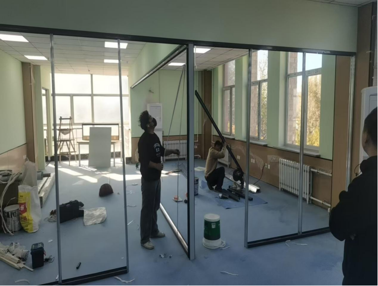 图为蒲河校区图书馆三楼智慧研修空间玻璃隔断安装作业