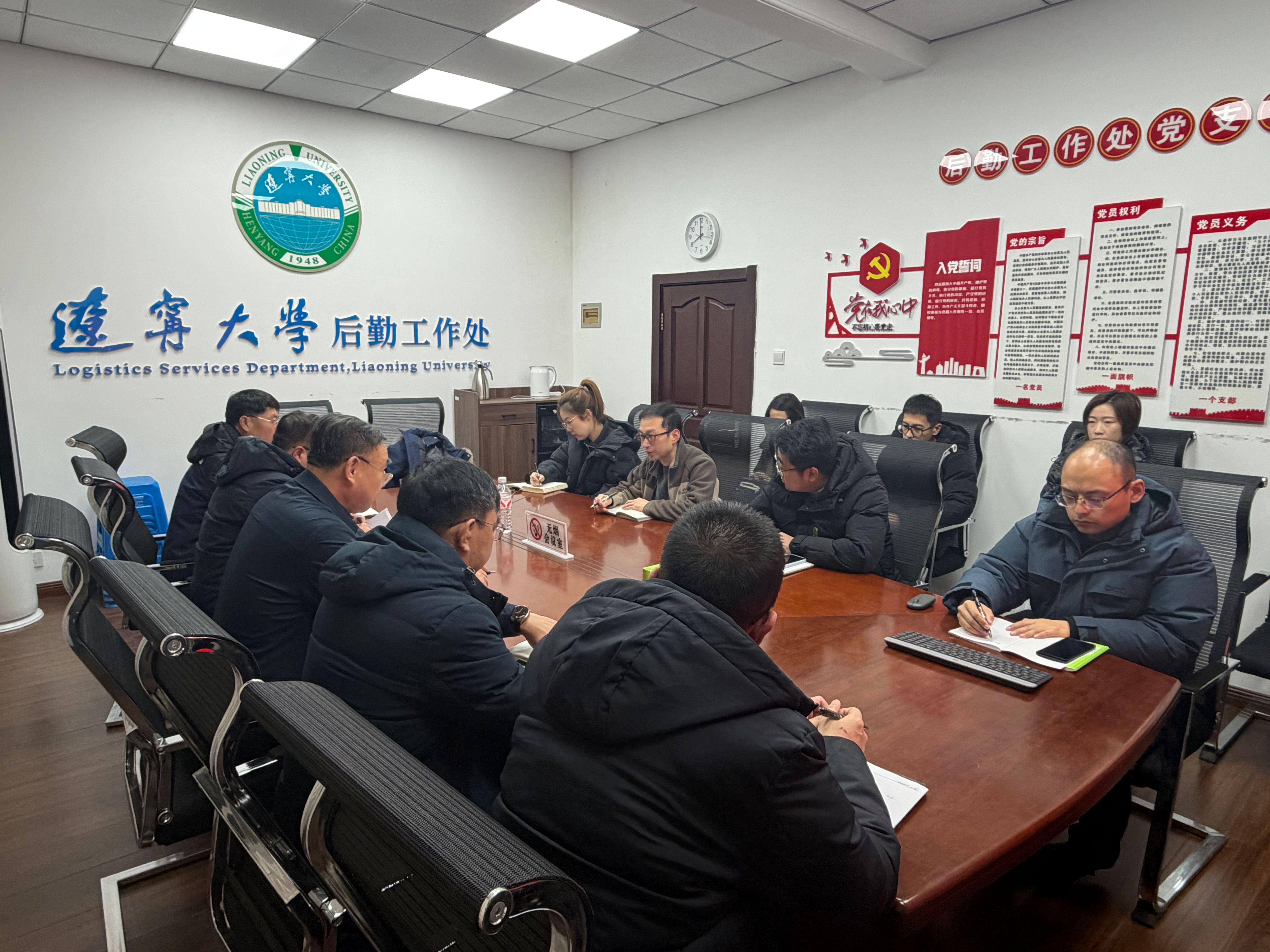 会上,黄大军处长提出了本周10项工作安排,对继续推进省发改委批复辽宁大学电力增容改造项目可行性研究报告能源报告编制及评审等相关工作、继续推进辽宁大学后勤智慧服务管理系统(三期)建设工作论证工作、组织全校辅导员进行智能宿舍管理系统操作培训、制作《2025年下半年辽宁大学后勤工作处全处大会会议记录汇编》《2025年下半年辽宁大学后勤工作处在校园网上发布的通知及信息汇编》、做好期末和寒假前崇山、蒲河校区供暖监管和保障相关工作、对蒲河、崇山校区除雪情况进行检查、对全处同志进行2026年元旦廉洁自律提示、调研蒲河校区经济学部综合楼房间分配方案等工作进行了部署,全处同志汇报了12月22日至12月28日的工作情况,反馈了当前工作中遇到的问题及建议。