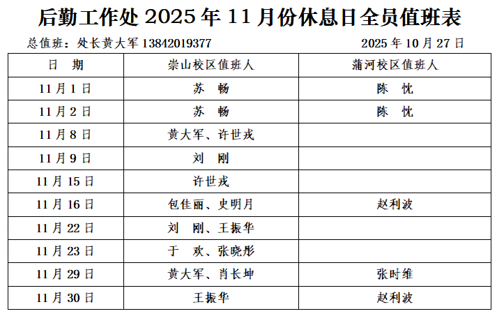 后勤工作处为全校师生持续提供优质后勤服务,在确保全年工作日正常运转的前提下,实行节假日及休息日全员轮值制度。现将2025年11月份休息日值班安排通知如下(详见附件):