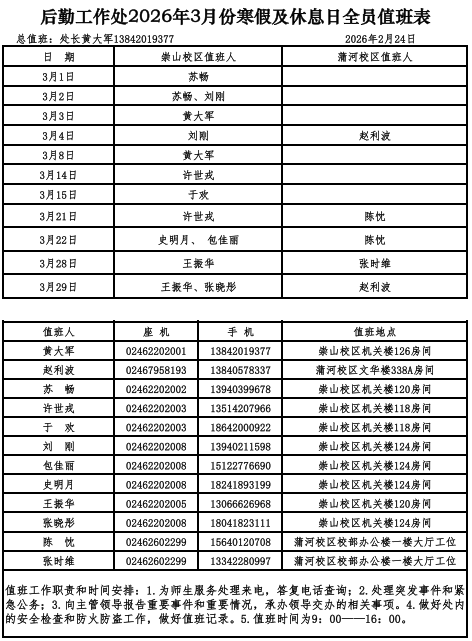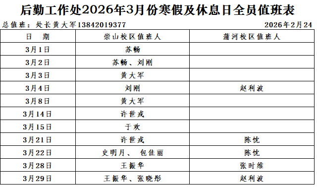 后勤工作处为全校师生持续提供优质后勤服务,在确保全年工作日正常运转的前提下,实行节假日及休息日全员轮值制度。现将2026年3月份寒假及休息日值班安排通知如下(详见附件):